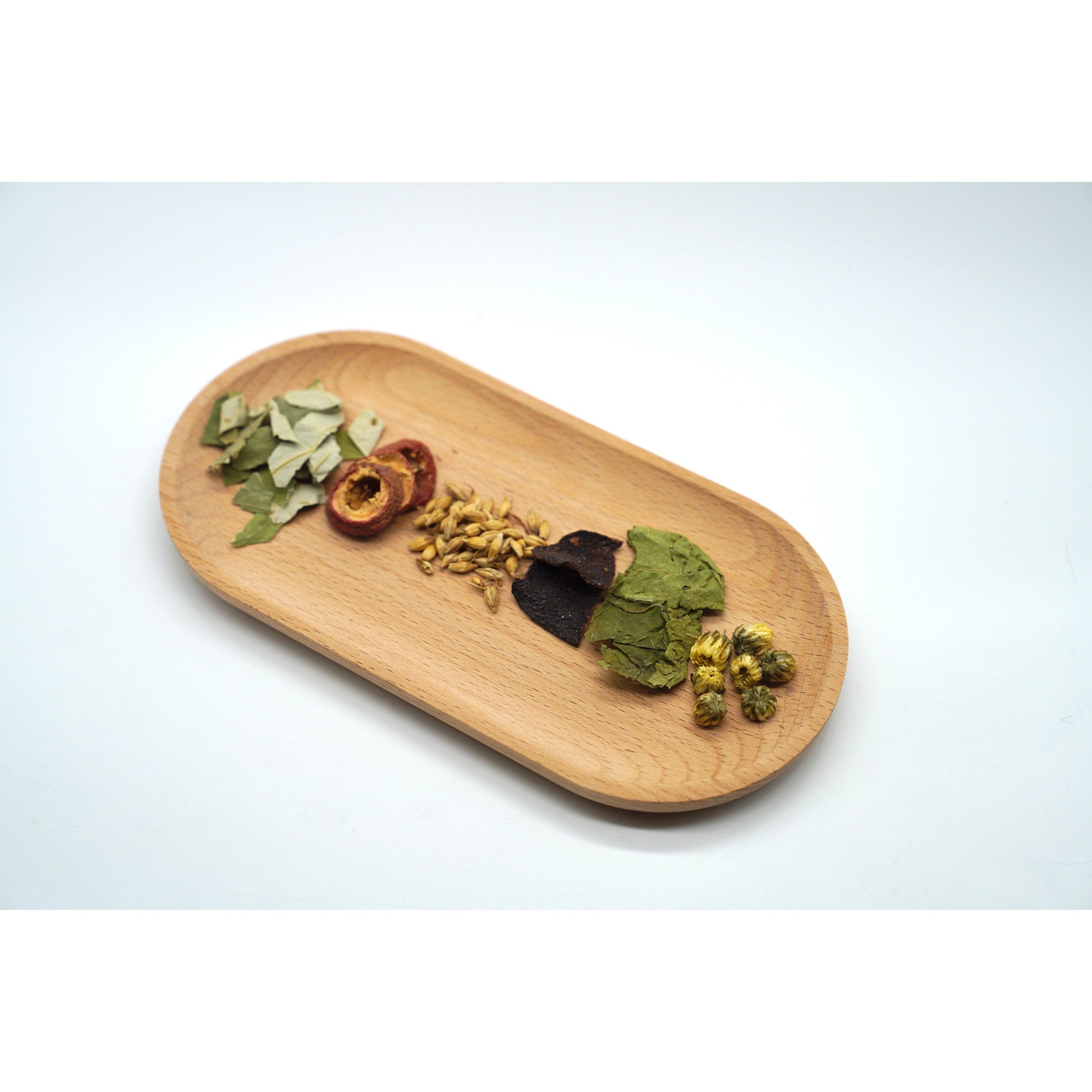 Roasted barley, Dried hawthorn, Lotus leaves, Mulberry leaves, 5 years aged & dried Tangerine peel, Chrysanthemum